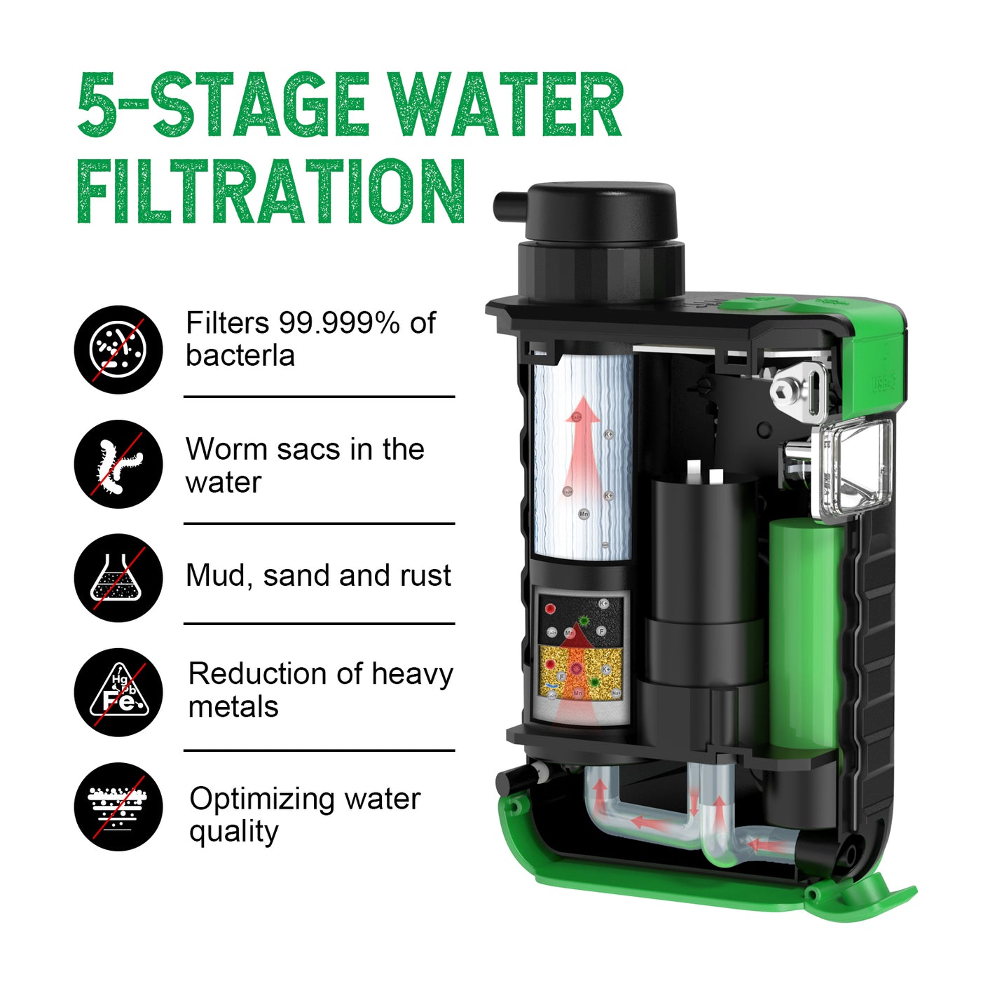Electric portable water purifier, equipped with double water purification cartridges, survival water purifier with 0.01 micron 5-stage filtration system, with emergency light. Perfect for camping, hiking, RV life, survival, emergency situations and outdoor activities.
