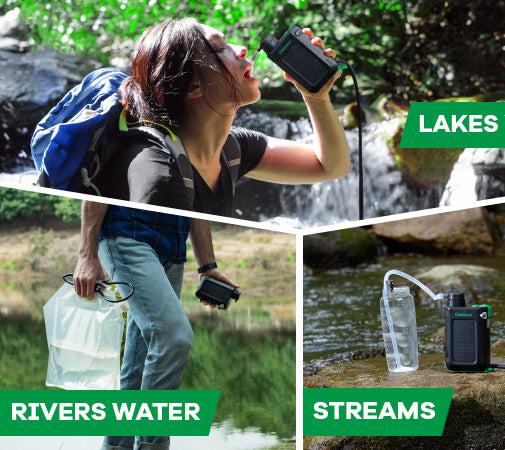 The Greeshow Rechargeable Outdoor Water Purifier fits into any pack pocket, requires zero setups and ridiculously easy to use, and makes clean, great-tasting drinking water for Outdoors, Survival, Travel, Camping, Emergency, and Everyday use by simply pressing a button- 700ml (23 oz.)/min. The automatic filtration process is initiated and runs effortlessly. On-the-go filtration and purification for the hiker, backpacker, camper, emergency prepper, or a global traveler seeking fast-flow purified water for chugging, filling hydration reservoirs, or cooking. Simply—Throw. Touch. Drink.